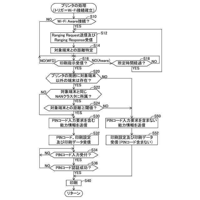 上記の構成によると、プリンタは、特定の端末装置から印刷指示を受信し、かつ、プリンタの周囲に異なる端末装置が存在する場合に、認証情報の入力をユーザに要求する。そして、プリンタは、ユーザによって入力された認証情報の認証が成功する場合に、印刷指示に従った印刷を実行する。仮に、上記の異なる端末装置が存在する場合には、認証が実行されないと、第三者によって印刷結果が取得されるおそれがある。これに対し、上記の構成によると、認証が実行されるので、第三者によって印刷結果が取得されるのを抑制でき、この結果、セキュリティが向上する。一方、プリンタは、特定の端末装置から印刷指示を受信し、かつ、プリンタの周囲に異なる端末装置が存在しない場合に、認証情報の入力をユーザに要求することなく、印刷を実行する。プリンタの周囲に異なる端末装置が存在しない場合には、第三者によって印刷結果が取得される可能性は低い。上記の構成によると、このような状況ではユーザが認証情報を入力せずに済むので、ユーザの利便性が向上する。