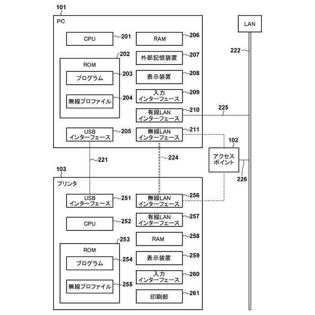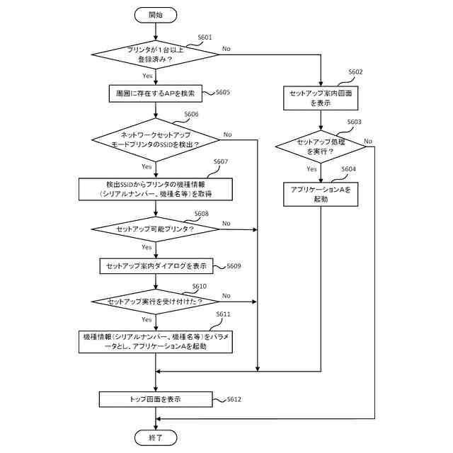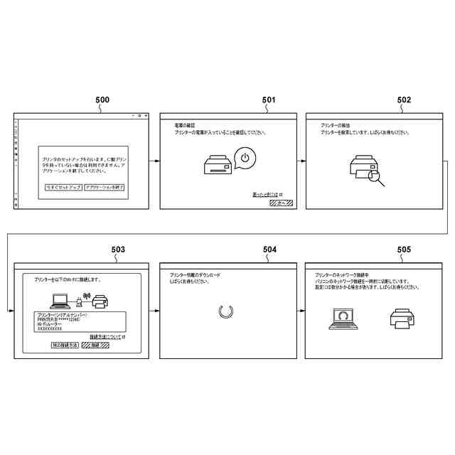 ここで、プリンタは、無線LANへの接続設定が必要な場合に自動的に、あるいはプリンタの操作部をユーザが操作することにより無線設定モードとなる。また、無線設定モードのプリンタの検出とは、プリンタがアクセスポイント(AP)となり、端末装置のアプリケーションがそのAPを検出することである。アプリケーションは、APとなっているプリンタに端末装置をPeer to Peer接続(P2P接続)する。そして、それまで接続していた無線LANの情報、例えばAPのSSID(Service Set Identifier)やパスフレーズをプリンタに送信することで、プリンタの無線LANへの接続設定を行う。また、無線LANへの接続設定の完了後、プリンタは、無線設定モードを解除し、端末装置から指定されたAPに接続する。端末装置は、それまでに接続していたAPへの接続に戻る。一般的にプリンタの利用を開始する場合、このような無線LANへの接続設定を含む処理や関連アプリケーションのインストール処理が必要である。それらを担うアプリケーションは、プリンタのセットアップ処理を行うセットアップアプリケーションと呼ばれることがある。