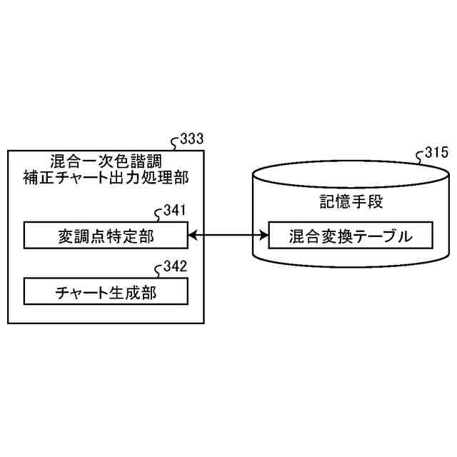 前記混合一次色の諧調値と、前記混合一次色を構成する前記通常色材及び前記淡色色材のそれぞれの諧調値と、を対応づけた変換テーブルに基づいて、前記混合一次色において前記通常色材の出力が開始されるときの前記混合一次色の諧調値を変調点として特定する変調点特定手段と、