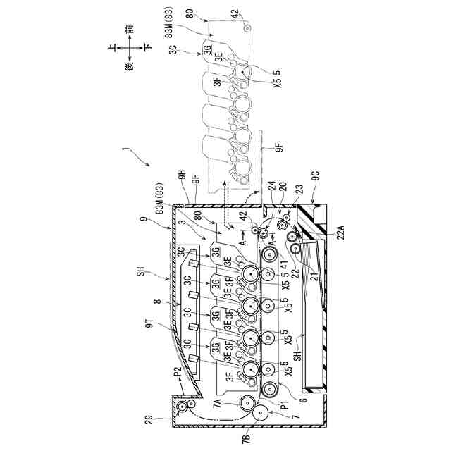 第2ローラは、ドロワよりも下方において本体筐体に回転可能に支持されている。第2ローラは、感光ドラムに向けてシートを搬送する。ジョイントシャフトは、幅方向に延びる軸部を有し、軸部における幅方向の一端に伝達される駆動力を幅方向の他端から第2ローラに伝達する。