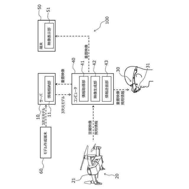 【解決手段】 空撮映像表示システム100は、3次元モデルMDの情報を格納するサーバ10と、飛翔状態で空撮映像APを撮影する撮影装置20と、撮影装置20の視認とともに重畳映像SVを表示する表示装置30と、コンピュータ40と、を備える。コンピュータ40は、少なくとも、3次元モデルMDの情報、及び、空撮映像APの情報を取得する情報取得部41と、前記取得された情報に基づいて、重畳映像SVを生成する映像生成部42と、表示装置30に向けて、少なくとも、前記生成された重畳映像SVを送信する情報送信部43と、を備える。