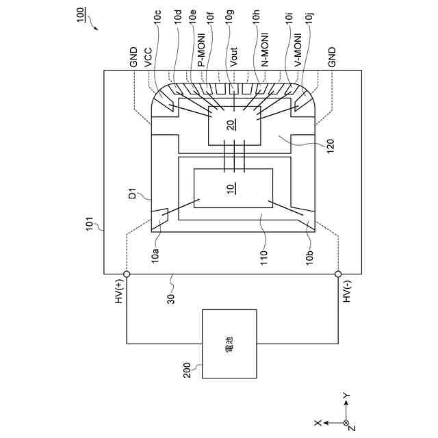 半導体パッケージ100は、凹部D1を有するケース101を備えている。ケース101は、樹脂又はセラミックなどの絶縁性材料からなる。XYZ三次元直交座標系を設定する。半導体パッケージ100の厚み方向をZ軸方向とし、Z軸方向に垂直な方向をX軸方向とし、Z軸及びX軸の双方に垂直な方向をY軸方向とする。Z軸の正方向は、凹部D1の深さ方向(下方向)とする。