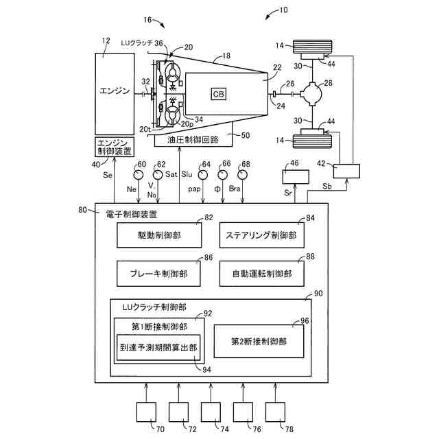 【解決手段】電子制御装置80は、自動運転走行の制御を行う自動運転制御部88と、自動運転走行中で、且つLUクラッチ36が係合状態の場合は、先行車両との車間距離Dまたは車速Vが、目標車間距離Dtまたは目標車速Vtに到達するまでにかかる車間距離到達予測期間Tdまたは車速到達予測期間Tvを算出する到達予測期間算出部94と、車間距離到達予測期間Tdまたは車速到達予測期間Tvが、予め設定された目標到達期間Tgより大の場合はLUクラッチ36を解放状態に切り替え、目標到達期間Tg以下の場合はLUクラッチ36の係合状態を継続する制御を行う第1断接制御部92と、を含む。