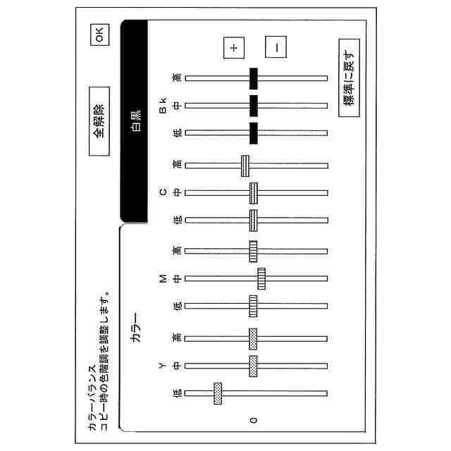 出力画像データに基づいて媒体上に形成された画像を見て、ユーザが色合いに不満をもつ場合がある。こうした場合に、CMYKを増減させることで色合いを調整するカラーバランス調整が行われることがある。従来の画像形成装置は、単一の色補正テーブルに基づいてカラーバランス調整を行う。上述のように、一般的な色補正テーブルはCMY値をK値に置き換える割合が高いので、CMYトナーの消費量を抑えることができる反面、カラーバランスを調整しても出力画像データに反映されにくいため、ユーザが意図するようにカラーバランス調整を行うことが困難だった。