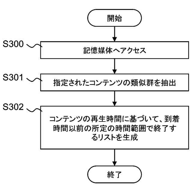 前記特定のコンテンツと、前記複数のコンテンツのそれぞれの再生時間と、前記到着予測時間とに基づいて、最後に再生されるコンテンツの再生が、前記到着予測時間から第1所定時間遡った時間までの範囲において終了するように前記リストを生成することと、