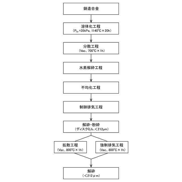特許文献1では、鋳造合金に水素解砕処理を施した磁石原料に対して、高温水素化工程により順変態反応(HD反応)を生じさせた後、制御排気工程と強制排気工程を連続して行ない、逆変態反応(DR反応)を生じさせている。つまり特許文献1では、水素解砕処理後の磁石原料に、HDDR処理を一括して行なっている。