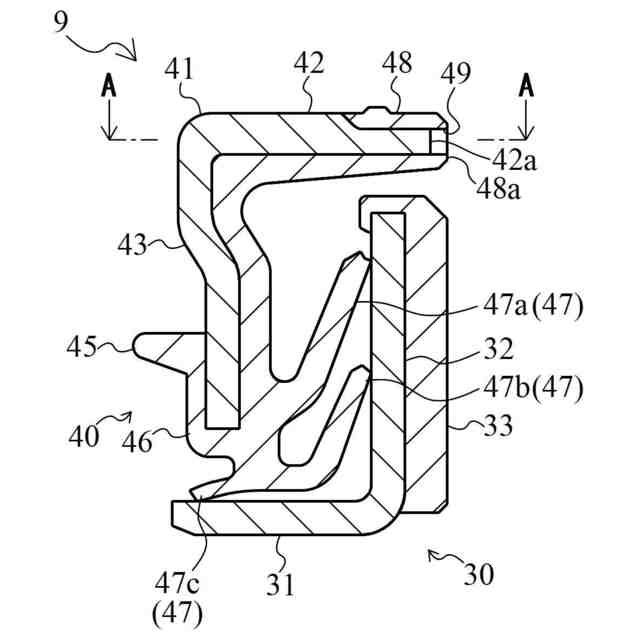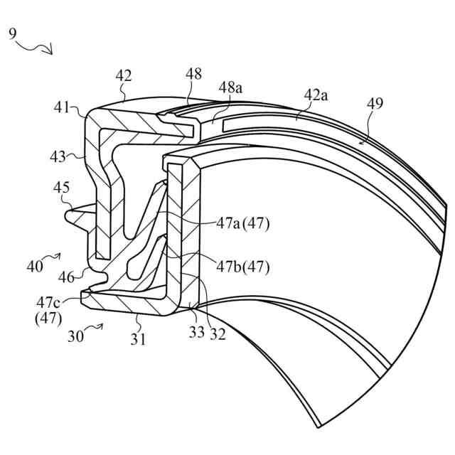 また、引用文献2の密封装置においては、第1弾性シールの第2円筒部の端部に外輪の環状凸部が軸方向外側から密着する構成にあたり、外輪の環状凸部に第1弾性シールの第2円筒部の端部が入り込んでいる。このため、第1芯金及び第1弾性シールと、第2芯金及び第2弾性シールと、の相対的位置が軸方向にズレることを抑制することが考えられる。もっとも、この密封装置においては、第1弾性シールは、第1芯金の円筒部の軸方向内側部分の内周面に密着している第1円筒部と、第1芯金の円筒部の軸方向外側部分の外周面に密着している第2円筒部と、第1芯金の円筒部の複数の貫通孔に挿入されて第1円筒部と第2円筒部とを連結する複数の連結片とを有することから、構造が複雑なものとなっていた。