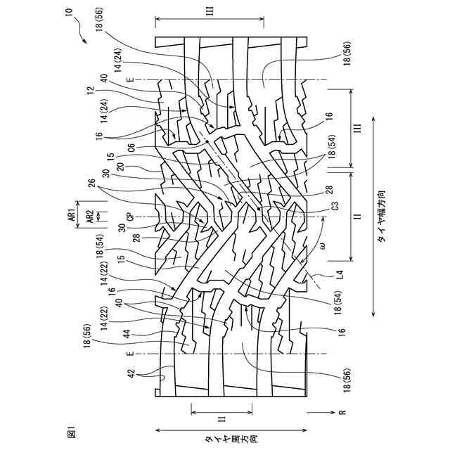 【解決手段】タイヤ10はトレッド面12を有する。トレッド面12は、接地端Eからタイヤ赤道面CPに向かってタイヤ周方向の一側へ傾斜し、タイヤ周方向に複数配置された傾斜溝14と、タイヤ赤道面CPに対しタイヤ幅方向の両側にそれぞれ配置され、傾斜溝14同士を連通するタイヤ周方向に沿って延在する周方向溝16と、を備える。傾斜溝14は、周方向溝16の間に区画形成されたセンター陸部54に形成された分岐溝部26を有する。分岐溝部26は、第1分岐溝28と、第2分岐溝30と、を含む。第1分岐溝28は、タイヤ周方向の一側へ傾斜し、先端がタイヤ周方向の一側に隣接する他の傾斜溝14に連通している。第2分岐溝30は、タイヤ周方向に対し第1分岐溝28と逆側へ傾斜し、先端がセンター陸部54内で終端している。