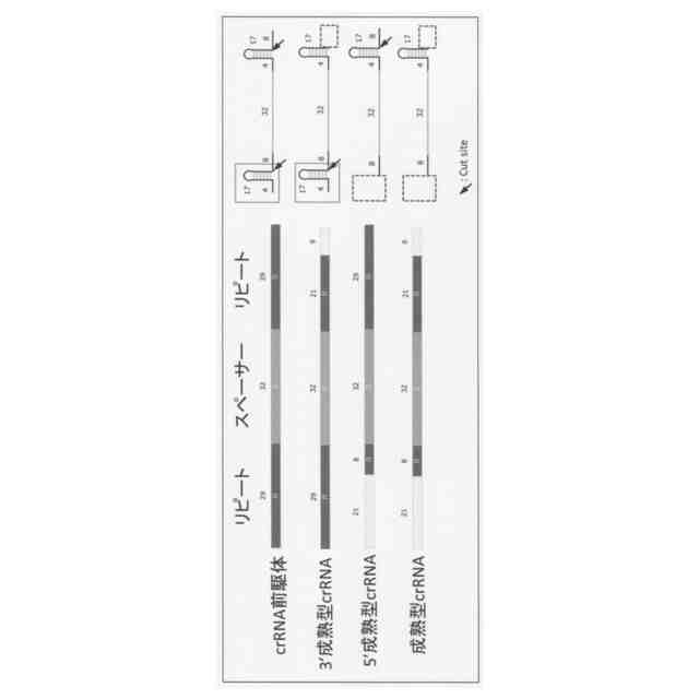 これまで、タイプI CRISPR-Casシステムを用いた真核細胞内でのゲノム編集の手法では、両末端に完全長のリピート配列を残したcrRNA前駆体(precursor crRNA)を用いることが必要であることが報告されている。かかるcrRNA前駆体が真核細胞内に導入されると、同細胞内でCasタンパク質(Cas5タンパク質、Cas6タンパク質)によるプロセシングを受けて成熟型crRNA(mature crRNA)となり、かかる成熟型crRNAとカスケードタンパク質とが標的領域付近で複合体(カスケード複合体)を形成し、ヌクレアーゼ活性を有するCasタンパク質が前記標的領域を切断することで、ゲノム編集が可能となる。