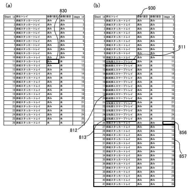 (a)は図9(a)に示すタイミングでのジョブ管理部が管理するシート情報を示す図、(b)は図9(b)に示すタイミングでのジョブ管理部が管理するシート情報を示す図。