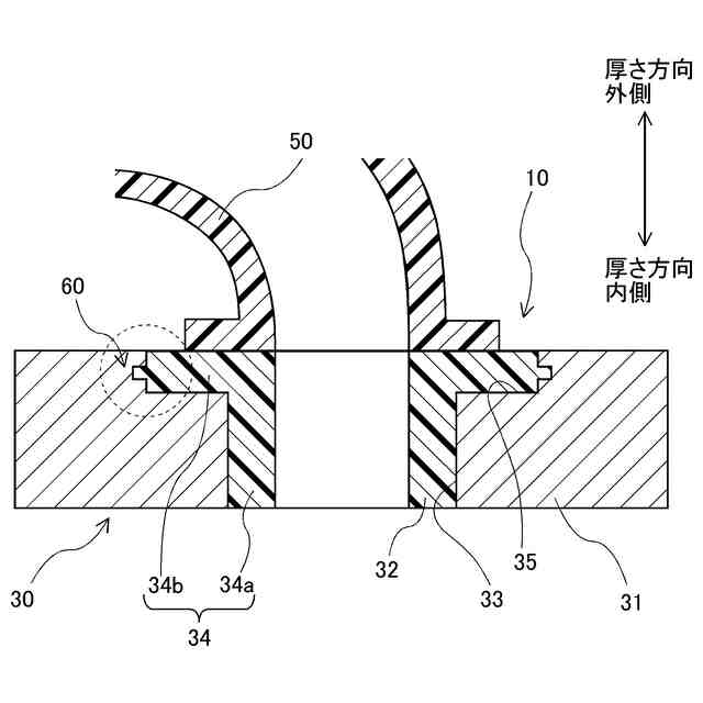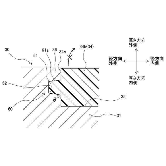 前記被覆部における前記フランジ部の径方向外端面に形成され、前記フランジ部の径方向外端面における前記厚さ方向の外端よりも内側の箇所から径方向外方に突出する凸部と、