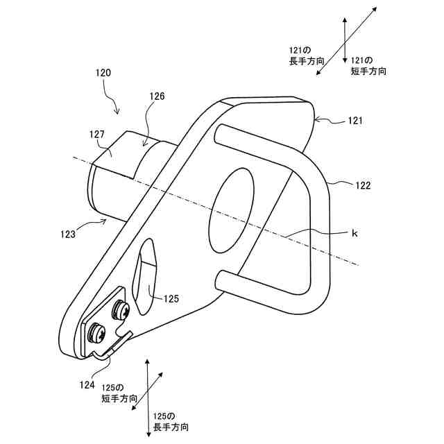 平面視における長手方向の寸法が短手方向の寸法よりも大きい略紡錘状又は略楕円状の形状を備えるとともに、回動中心よりも前記長手方向の一方側に長孔状の係合孔を備えており、