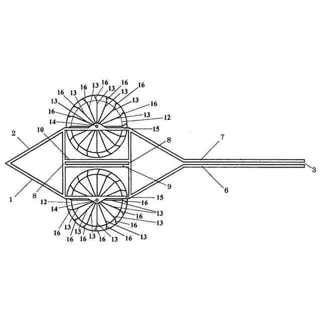 そして、軸受付フレームバー15の軸受固定での、回転する内側円筒板12と同形多段ドーナツ状円板11の間に羽根プレート16を設置接合させ、その羽根プレート16の遠心方向からの設置角度は、右側の同形多段ドーナツ状円板11内の羽根プレート16ではV字右プレート1の角度と一致させ、左側の同形多段ドーナツ状円板11内の羽根プレート16ではV字左プレート2の角度と一致させる。