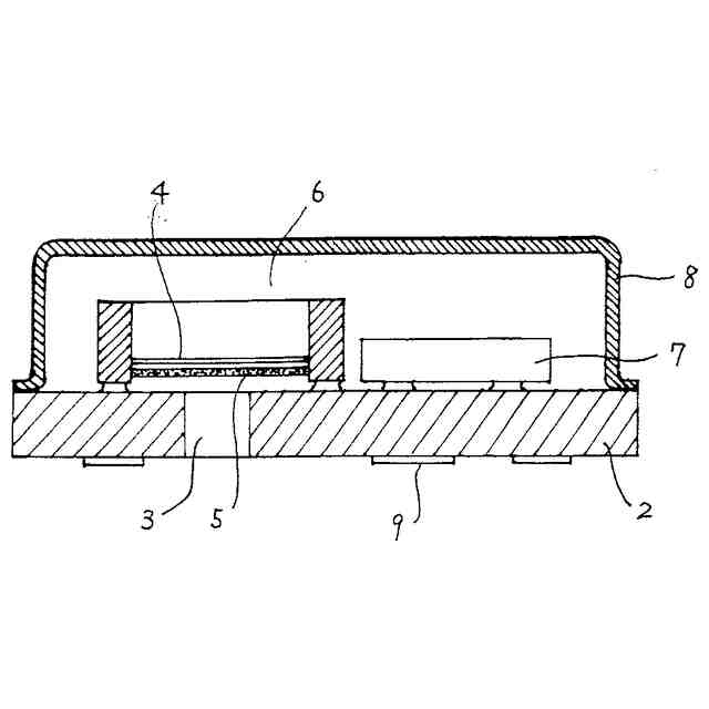 一方、基板上には、バックプレート5にバイアス電圧を供給する昇圧回路や音圧変化の信号を増幅するプリアンプを集積した特定用途向けの通称ASICと呼ばれる半導体チップ7が取り付けられており、これらはキャップ8で封止された一体構造となっている。なお、9はMEMSマイクロフォン1を基板に取り付けるためのはんだ用パターンである。