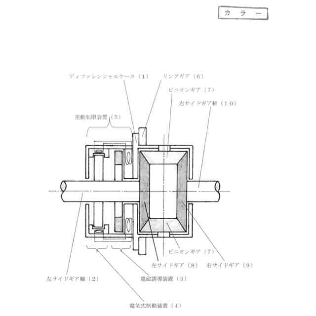 (ハ) (イ)での発生電流を利用し、更なる差動制限装置(5)として左サイドギア軸(2)にディファレンシャルケース(1)の延長側にパウダークラッチ等の電気式制動装置(4)を設置する方法をとる。