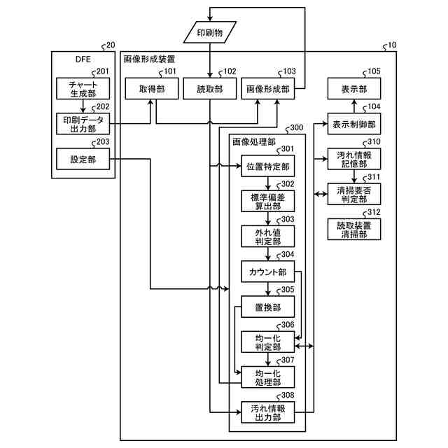 画像形成装置で出力する画像の濃度について、複数の吐出ヘッドからインクが吐出されることによって形成される画像をスキャナで読み取り、読み取った結果に基づいて、吐出ヘッドが吐出するインク量を制御することにより印刷画像の濃度を均一にする技術が既に知られている。濃度を均一化するための補正処理において、吐出ヘッドで印字した印刷物をスキャナで読み取る処理をする際に、当該スキャナに汚れがあると補正精度が低下する。したがって、濃度の均一化処理を行うためには、適正にスキャナの汚れを検知する必要がある。そして、検知結果に基づいてスキャナの汚れを除去することにより、精度よく濃度の均一化処理が可能となる。