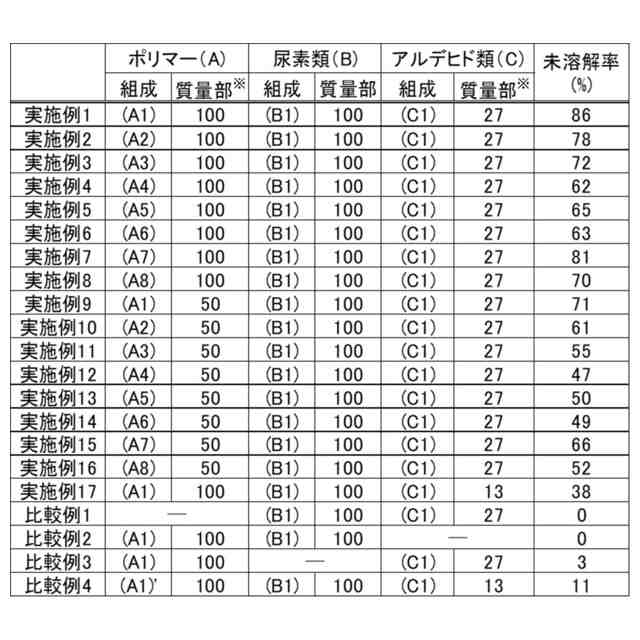 前記反応物は、1級及び/又は2級アミド基を含有する不飽和化合物に由来する構成単位(a1)を含むポリマー(A)、尿素類(B)及びアルデヒド類(C)を含む反応成分の反応物である、