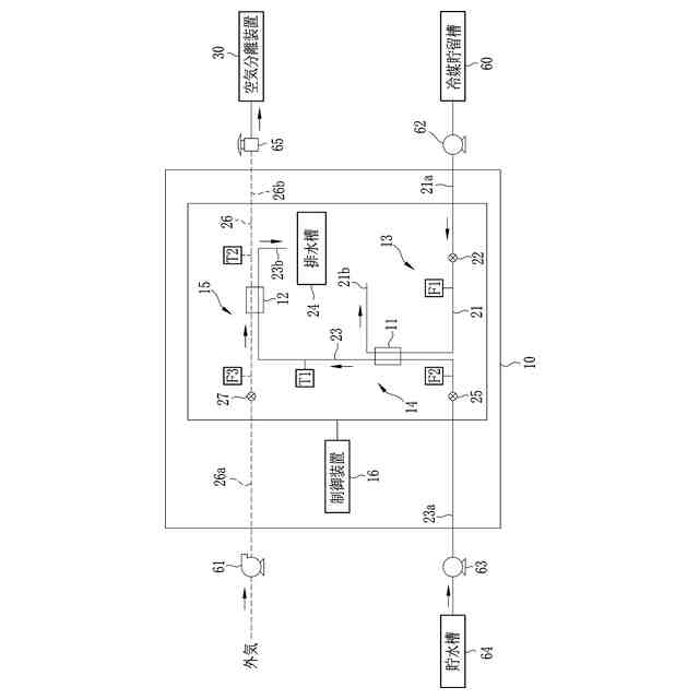 液体窒素、液体酸素及び液体空気のいずれかからなる第1の冷媒と、水からなる第2の冷媒と、の間で熱交換を行い、前記第2の冷媒を冷却する第1熱交換器と、