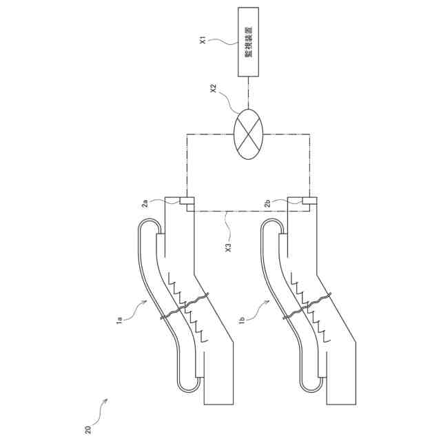図1に示すように、マンコンベヤシステム20は、第1マンコンベヤ1a及び第2マンコンベヤ1bを備えている。第1マンコンベヤ1aは、監視装置X1と通信可能である第1処理装置2aを備えており、第2マンコンベヤ1bは、監視装置X1と通信可能である第2処理装置2bを備えている。なお、本明細書及び図面において、第1マンコンベヤ1a及び第2マンコンベヤ1bを区別しない場合は、単に、マンコンベヤ1とし、第1処理装置2a及び第2処理装置2bを区別しない場合は、単に、処理装置2とする。