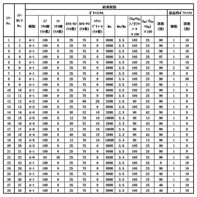 特許文献1には、低温定着性に優れるトナーを得るため、ビスフェノールAのアルキレンオキサイド付加物とイソフタル酸化合物及び脂肪族飽和カルボン酸化合物とを重縮合して得られる重縮合樹脂成分とスチレン系樹脂成分と有する非晶質複合樹脂を含有したトナーが開示されている。テレフタル酸化合物等を原料として用いる場合と比較して、イソフタル酸化合物を原料とした場合、ポリマー鎖の絡みが少ないため、柔軟な高分子鎖を形成し、定着時の溶融粘度を低下させることができる。