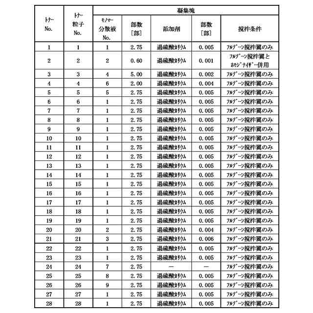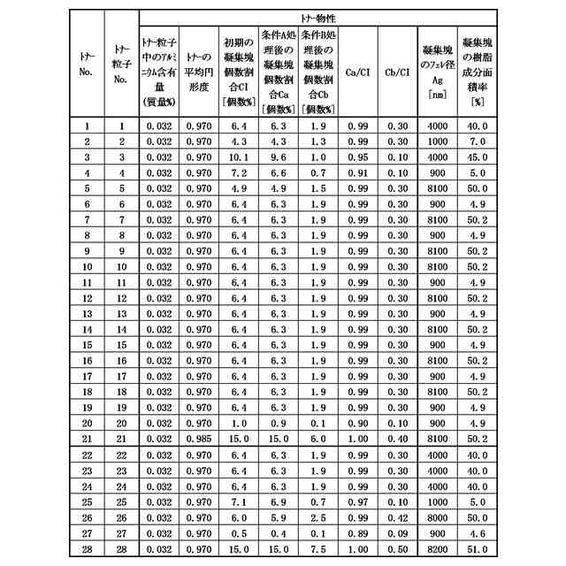 多数枚画像形成時(耐久時)において、画像濃度の低下が発生しやすいという課題があった。本発明者らの検討により、この課題にはトナーの流動性の低下が大きく関与しており、多数枚の画像形成を行った際の機械的ストレスによる凝集塊(シリカと樹脂を含有する凝集塊)の崩れ、そしてトナー粒子表面への外添剤の埋没が影響を与えていると推測した。
