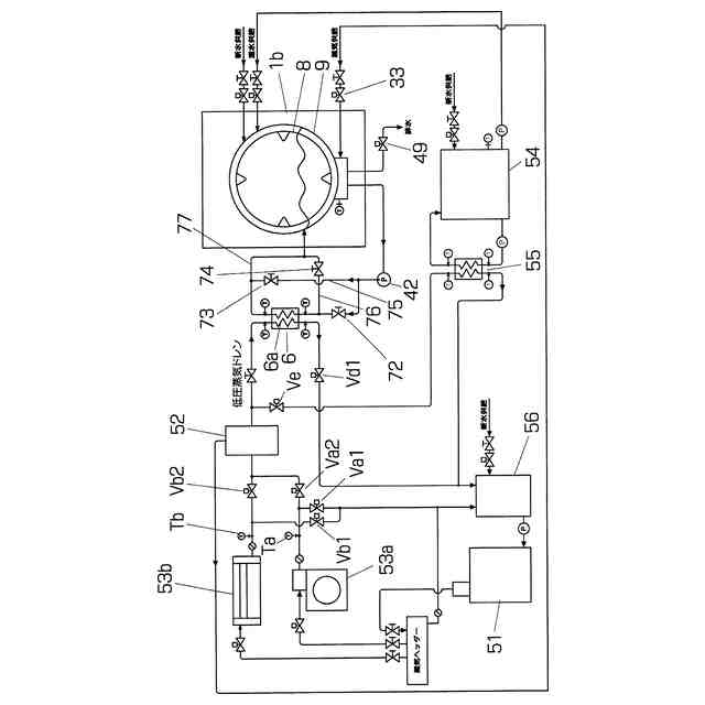 その対策として、一次ドレンをボイラ給水用ドレンタンクに戻す手前でフラッシュ蒸気発生器に通し、一次ドレンが保有する熱をフラッシュ蒸気として取出すと同時に高温水に分離してフラッシュ蒸気を洗濯機に投入し、残りの高温水をボイラ給水用ドレンタンクに戻している。或いは、一次ドレンを熱交換器に通し、洗濯用温水にして熱回収を行って、熱回収後のドレンをボイラ用ドレンタンクに戻している場合もある。