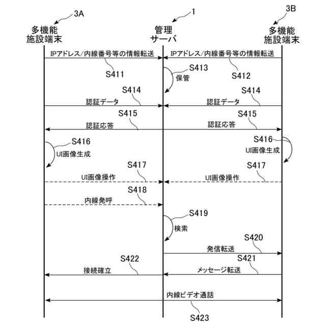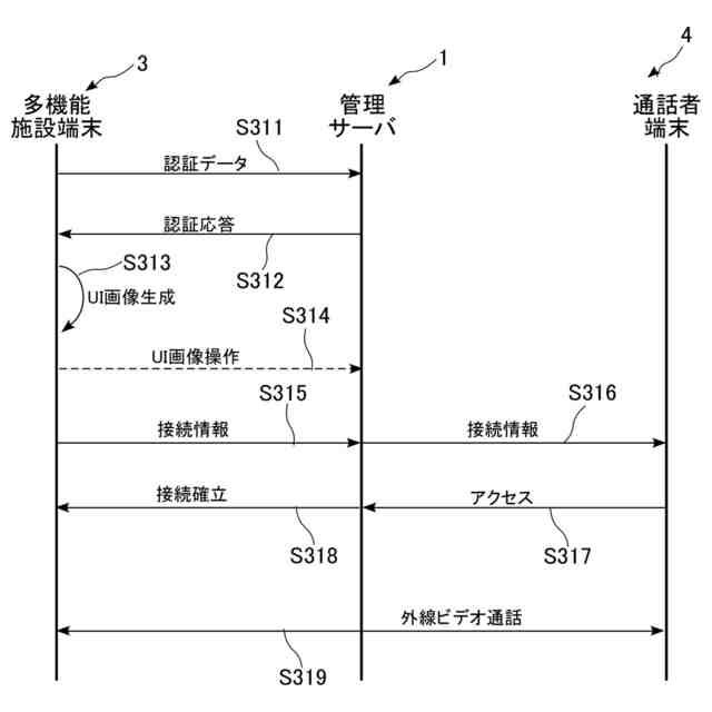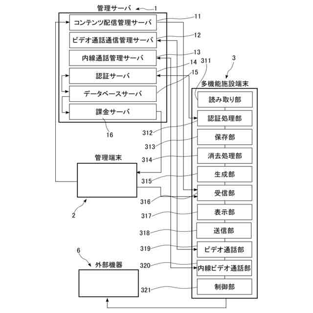 前記多機能施設端末は、前記所定施設の外部の1又は2以上の通話者端末に対して、インターネットから前記管理サーバを介して前記多機能施設端末との接続情報を送信する送信部と、前記通話者端末による前記接続情報からのアクセスで、インターネットから、前記管理サーバを介して、ブラウザ上で前記通話者端末との間でビデオ通話の接続を確立するビデオ通話部と、を有し、