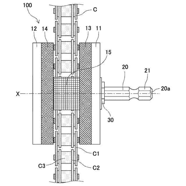 第1回転体、前記第1回転体と対向するように設けられた第2回転体、前記第1回転体の軸中心と前記第2回転体の軸中心とを連結する連結軸、及び、前記連結軸の一端側に設けられ、外部の回転駆動装置に取り付け可能な取付部を備え、