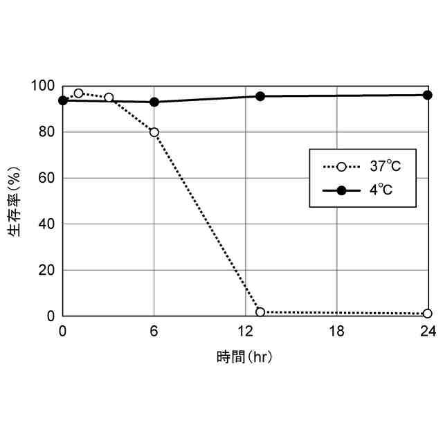 4℃又は37℃で所定時間保管したスフェロイドの細胞生存率を示す。