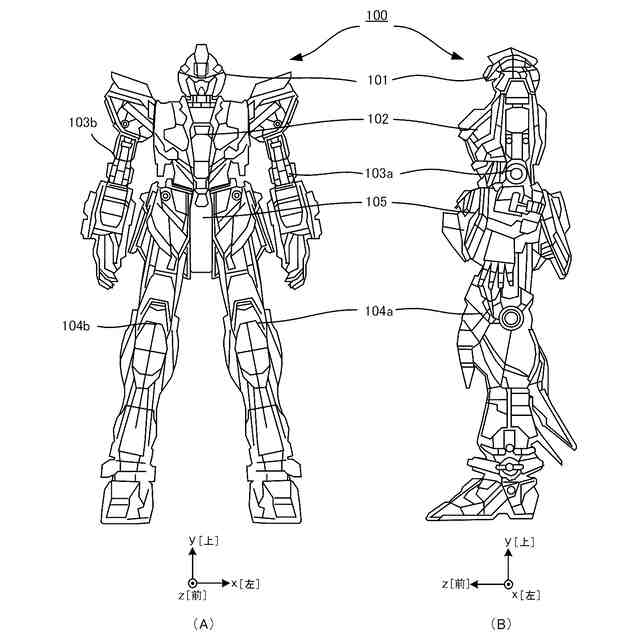 まず図1を参照して、本実施形態に係る模型玩具100の外観構成の一例について説明する。図1(A)は模型玩具100の外観正面を示し、図1(B)は模型玩具100の外観側面を示す。なお、x,y,zの矢印はそれぞれ模型玩具における上、左、前方向の向きを示し、他の図面についても同様である。