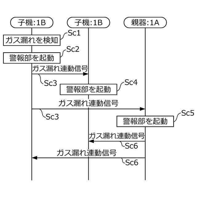 この火災警報システムに例示されるような警報システムでは、警報器間で様々な信号を送受信することができる。例えば、各警報器に火災感知部とガス漏れ検知部を備えさせ、警報器間で火災感知信号とガス漏れ検知信号を送受信させることができる。