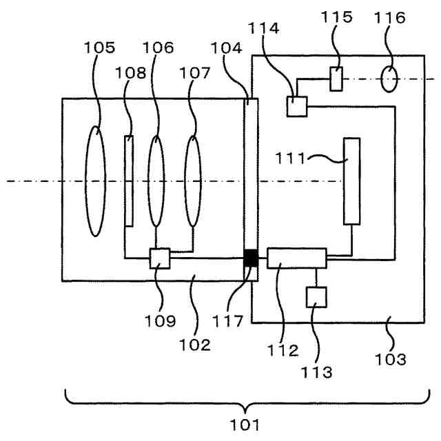 は、ズーミング用レンズ106、フォーカシング用レンズ107および絞り108の位置検出と、カメラボディ103の制御装置との間の通信による、レンズ情報の送信およびカメラ情報の受信とを行う。