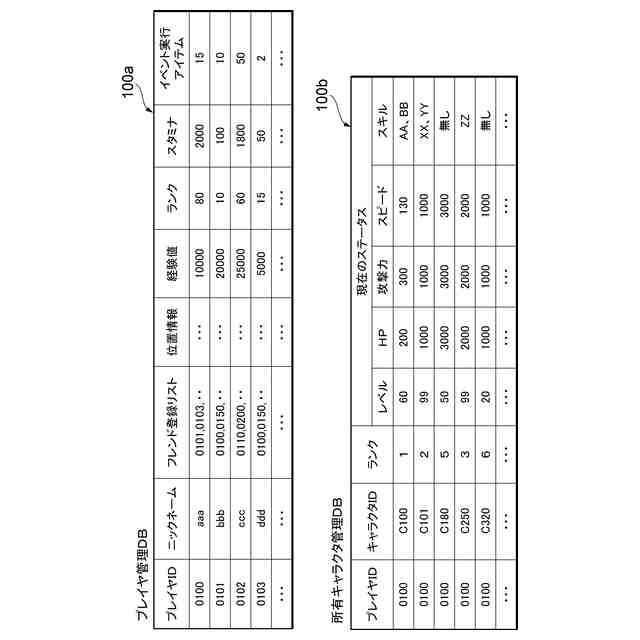 プレイヤ管理DB及び所有キャラクタ管理DBの一例を示す図である。