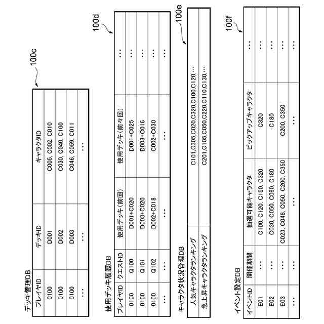 デッキ管理DB、使用デッキ履歴DB、キャラクタ状況管理DB及びイベン ト設定DBの一例を示す図である。