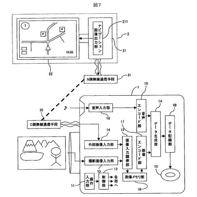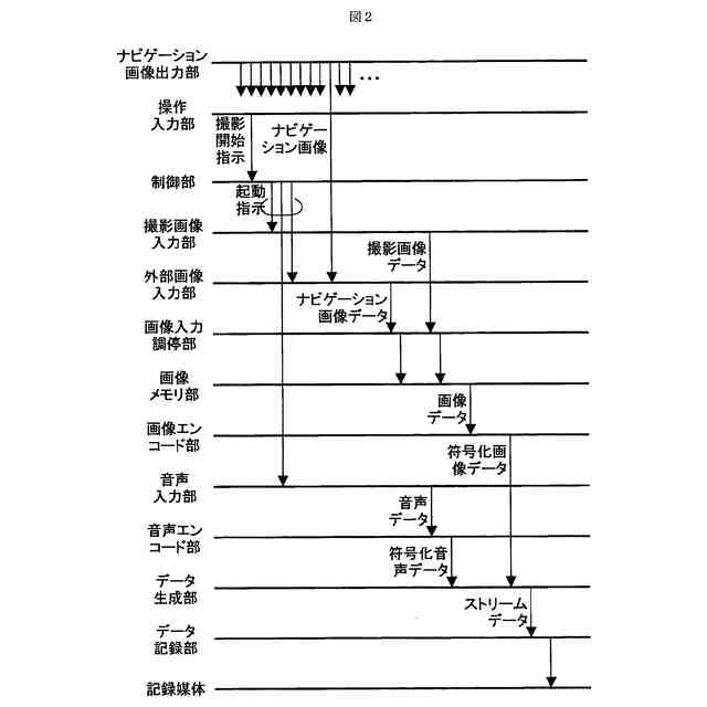 【解決手段】ビデオカメラに、通常の撮影画像を入力する手段のほかに、別の映像入力源から画像を入力する手段を設け、さらに、これら2つの入力手段からの映像データを調停して取り込み、メモリに格納する画像入力調停部を設ける。これにより、上記別の映像入力源を、カーナビゲーションの映像出力端子とすることで、カーナビゲーションの画面(地図情報)と、ユーザが撮影した画像を合わせてメモリ内に取り込める。また、監視用途ビデオカメラなどにおいては、地図画像データをあらかじめ保存している媒体、例えばUSBフラッシュメモリやSDカードなどと該媒体から地図画像データを読み出す読み出し手段を別の映像入力源とすることで、同様にメモリ内に取り込める。このメモリ内のデータを動画像として圧縮・符号化処理することで、地図情報とユーザの撮影画像を1つの動画像として処理できる。