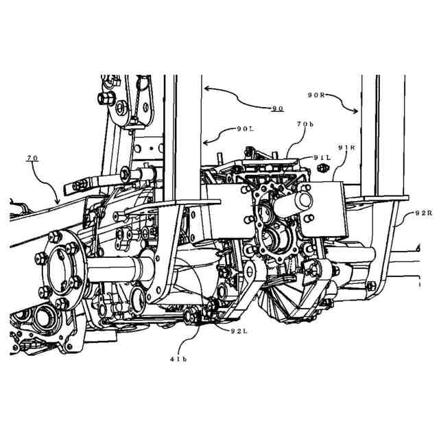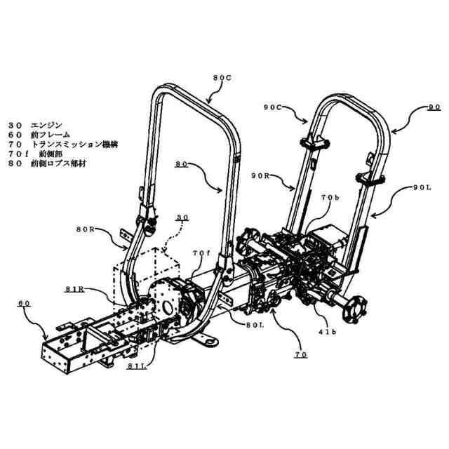 【解決手段】 エンジン30の左右側面に固定され、前輪40fを支持する前フレーム60と、エンジン30へ取付けられたトランスミッション機構70と、前側ロプス部材80とを備え、前側ロプス部材80の下端は、前フレーム60の側面およびトランスミッション機構70の側面に亘って取り付けられた前側ロプス左プレート81Lおよび前側ロプス右プレート81Rに固定されている。