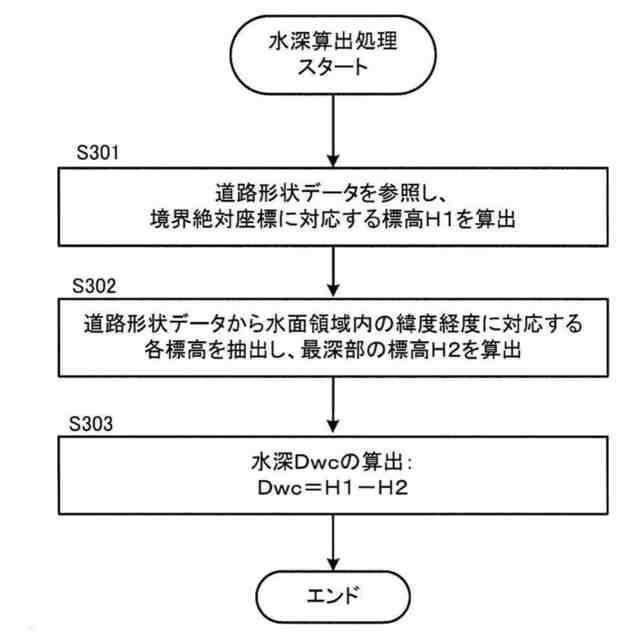 【解決手段】ナビゲーション装置1のシステムコントローラ20は、カメラ2が出力するカメラ画像Icに基づき、道路上において冠水している水面領域Awと当該水面領域Aw以外の道路上の道路領域Arとの代表境界位置Prを検出する。そして、システムコントローラ20は、代表境界位置Prの緯度及び経度に基づいて、地図データ32の道路形状データに含まれる標高情報を参照することで、水深Dwcを算出する。