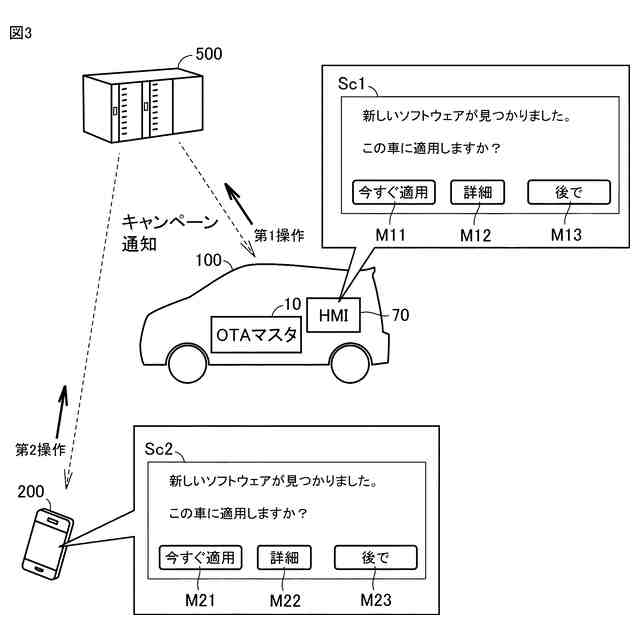 しかしながら、上記通知を受けるHMI(Human Machine Interface)として携帯端末が最善とは限らない。例えば、ユーザが車両を運転しているときにスマートフォンが上記通知を受けると、ユーザは、上記ソフトウェア更新に関する連絡(承諾要求)を、他の要件に関する連絡(例えば、緊急の連絡)であると誤解する可能性がある。こうした誤解は、ユーザの運転を妨げるかもしれない。その一方で、上記通知を受けるHMIを、車両に搭載された端末(以下、「車載端末」とも称する)に限定してしまうと、ユーザが乗車していないときにソフトウェア更新に関する上記通知(承諾要求)を受けることができなくなり、ユーザの利便性の低下を招く。