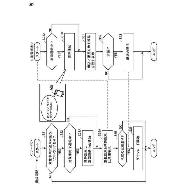 (第1項)当該サーバは、判定部と通知部とを備える。判定部は、車両が運転中であるか否かを判定するように構成される。通知部は、車両に搭載された制御装置のソフトウェアの更新に係る処理の承諾を車両のユーザに要求する通知を行うように構成される。判定部によって車両が運転中であると判定された場合には、通知部は、車両に搭載された車載端末に対して上記通知を行う。判定部によって車両が運転中ではないと判定された場合には、通知部は、車両のユーザによって携帯可能な携帯端末に対して上記通知を行う。