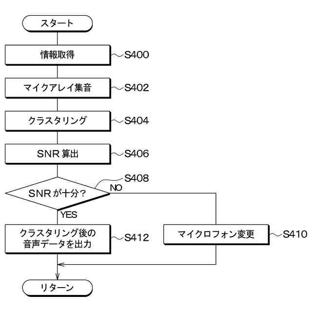 前記マイクロフォンにて集音された音に関するデータである音データに含まれる音の種類を、前記マイクロフォンが配置されている空間である音響空間(Sb)にいる人の音声の種類と、前記音声以外の音であるノイズの種類とに分類するクラスタリング部(S404)と、