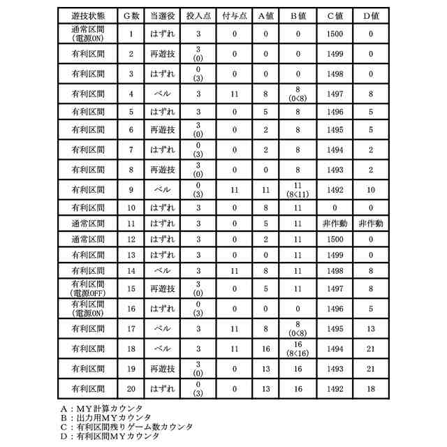 はじめに、本明細書における各用語の意義について説明する。「乱数」とは、回胴式遊技機において何らかの遊技内容を決定するための抽選(電子計算機によるくじであり、抽せんとも称することがある)に使用される乱数であり、狭義の乱数の他に擬似乱数も含む(例えば、乱数としてはハード乱数、CPUを含む主制御チップによって生成された内蔵乱数、擬似乱数としてはソフト乱数)。例えば、遊技の結果に影響を与えるいわゆる「基本乱数」、具体的には、特別遊技に移行するための特別役や入賞役(小役、再遊技役)と関連した「当選乱数」、等を挙げることができる。「CPU」とは、当業界において周知であるものと同義であり、使用されているアーキテクチャ(CISC、RISC、ビット数等)や処理性能等には何ら限定されない。「電断(電源断)」とは、遊技機に設けられた電源スイッチの操作実行有無に係らず、遊技機に供給される電源電圧が一定レベル以下となったことを指し、例えば、電源供給ユニットの破損や停電等による不測の事態による電源供給の遮断をも包含する。「ROM」とは、当業界において周知であるものと同義であり、情報を物理的に保持する(例えば、データ読み出し用の電流を与えた場合、導通する素子構成であれば「1」、導通しない素子構成であれば「0」となる)。RAMとは、当業界において周知であるものと同義であり、情報を電気的に保持する(例えば、データ読み出し用の電流を与えた場合、蓄電されていれば「1」、蓄電されていなければ「0」となる。尚、RAM内で保持されているデータの一部またはすべてに対して、電断時にはバックアップ電源が供給されるよう構成されていることが一般的である)。「遊技状態」とは、例えば、遊技メダルが獲得容易であり遊技者にとって有利な特別遊技状態(いわゆる大当り遊技であり、ボーナス作動中、1種BB作動中、1種BB作動時、2種BB作動中、2種BB作動時などと称することがある)、ボーナスの当選を持ち越している内部中状態(1種BB内部中、2種BB内部中などと称することがある)、再遊技役の当選率があらかじめ定められた値である通常遊技状態よりも再遊技役の当選率が高い(または低い)状態である再遊技確率変動遊技状態(RT状態)、当選した役を入賞させるためのリールの停止順、停止位置(停止操作態様と称することがある)を報知し得るAT(アシストタイム)中状態、前記RT状態とAT中状態とが複合したART(アシストリプレイタイム)状態、ATに関する処理を実行し得る有利区間とATに関する処理を実行しない通常区間、等が挙げられる。また、通常遊技状態においても、RT状態、AT中状態(「AT遊技状態」、「AT状態」、「報知状態」と称することもあり、単に「AT」と称することもある。また、AT中状態でない状態を、「非AT遊技状態」、「非AT状態」、「非報知状態」と称することもあり、単に「非AT」と称することもある。)、また、AT状態にて停止操作態様を報知することを、「ATを実行する」、「ナビを実行する」、「指示を実行する」、「押し順ナビを実行する」、「報知遊技を実行する」などと称することがある。ART中状態への移行抽選確率が異なる、高確率通常遊技状態、低確率通常遊技状態、等(本例では、抽選状態と称している)が挙げられる。また、遊技状態は複合しても問題ない{更に、これらの遊技状態や機能(例えば、AT中状態への移行抽選や、リールの停止順に係る報知指示の出力等)は、遊技進行を制御する主制御基板側ですべて実装してしまっても問題ない}。また、本例においては、ATに関する状態とRT状態とを個別に記載し、RT状態が「RT1」且つATに関する状態が「通常遊技状態」等と称しているが、RT状態とATに関する状態とを纏めてARTに関する状態としてARTに関する状態が「通常遊技状態」等と称してもよい。「当選役」とは、内部抽選(内部注抽せんと称することがある)により当選した条件装置の種類(または、条件装置番号)である。「報知状態」とは、後述する押し順ナビを実行可能なATに関する状態であり、リール停止順によって入賞する役が相違しないために押し順ナビが実行されない条件装置が当選したゲームであっても、ATに関する状態が押し順ナビを実行可能な状態であれば「報知状態」とするよう構成している。「カウンタ値」とは「報知遊技実行可能数」とも称し、後述する、AT残りゲーム数もしくはATカウンタM60のカウンタ値である。例えば、「報知遊技実行可能数」が1以上(「0」となった当該遊技も含めても良い)である場合には後述する押し順ナビが実行され得る。また、「報知遊技実行可能数」として、小役(主に、押し順ベル役)が当選したことに基づいて得られる遊技媒体の差枚数(払出し枚数から投入枚数を引いた枚数)や、押し順ベル役の当選回数、を採用しても良い。また、「特殊報知状態」とは、ATに関する状態のうち遊技者に最も有利となる状態であり、本例では、「上乗せ特化状態」と称している。なお、「所定の遊技状態」とは、