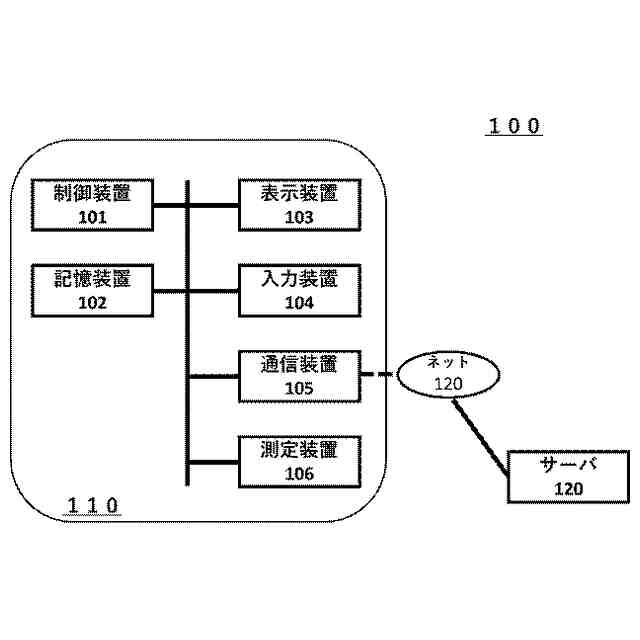 本発明の一実施形態として、PC、ノートパソコンや、典型的にはスマホやタブレットなどの利用者の情報処理端末にインストールされたプログラムを挙げる。情報処理端末110は、ヘルスケアプログラムを制御する制御装置101、記憶装置102、液晶モニタなどの表示装置103、タッチパネルやキーボードなどの入力装置104、外部ネットワークとの通信用の通信装置105、バイタルデータを測定する測定装置106等を備える。また、情報処理端末110とインターネットや無線接続あるいは優先接続などのネットワークであるネット120を介して、腕時計型、イヤホン型、バンド型、身体貼付型などのウェアラブル端末や、トイレなどに設置された血糖値測定装置、スマートミラーに搭載された撮像装置などの据え置き型測定器である測定装置116を情報処理端末に内蔵された測定装置106に代えて用いても良い。また、本実施例では情報処理端末にプログラムや必要なデータ等を情報処理端末110に収容してスタンドアローンで動作するシステムを例に挙げているが、ネット120を介してサーバ120と接続し、サーバ120と情報処理端末110のそれぞれにプログラムやデータを分散、あるいは、サーバ120にプログラムやデータを集約し、情報処理端末は単なる入出力装置として利用することも可能である。