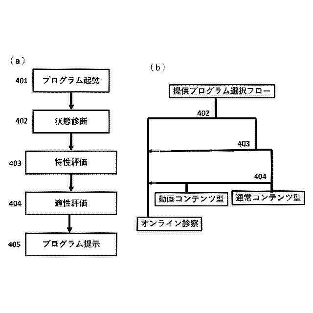 特許文献1の発明では、特定のプログラムを提供し、そのプログラムの継続率を向上させるためにアラートを発して、ユーザの離脱を防ぐ技術を開示している。また特許文献2では診断結果に応じて画一的な出力を提供する技術を開示するにすぎない。しかしながら、プログラムの種類によって、対象ユーザに対して適性がない場合がある、例えば、認知行動療法に基づくカウンセリングなどでは、うつ病の認知行動療法が薬物療法と同程度の有効性(抗うつ薬の有効率は60%程度)が示されている、つまり有効性を示さない場合があり得る、また、仮にユーザがプログラムに適性を持っていた場合でも媒体としてのユーザの情報処理端末の利用状況などの特性によって適性を示さない場合がある。つまり、発明者らは、プログラムを提供するにあたり、従来のように提供されたプログラムの継続性を向上させるだけでは十分ではなく、ユーザが継続しやすいプログラムを提供しなければユーザのプログラムの継続的利用は図れない。また、特許文献3のようにいったんワークを提供してからその実施状況に応じてワークを切り替える場合、ユーザからしてみると最初に提供されたもので相性が悪かったと感じた場合はワークが変更になっても再度挑戦しようという気にならない。とくに治療用アプリなどの場合はまだその効果が広く知られていないので顕著である。本願はこれらの課題を解決することを目的としている。