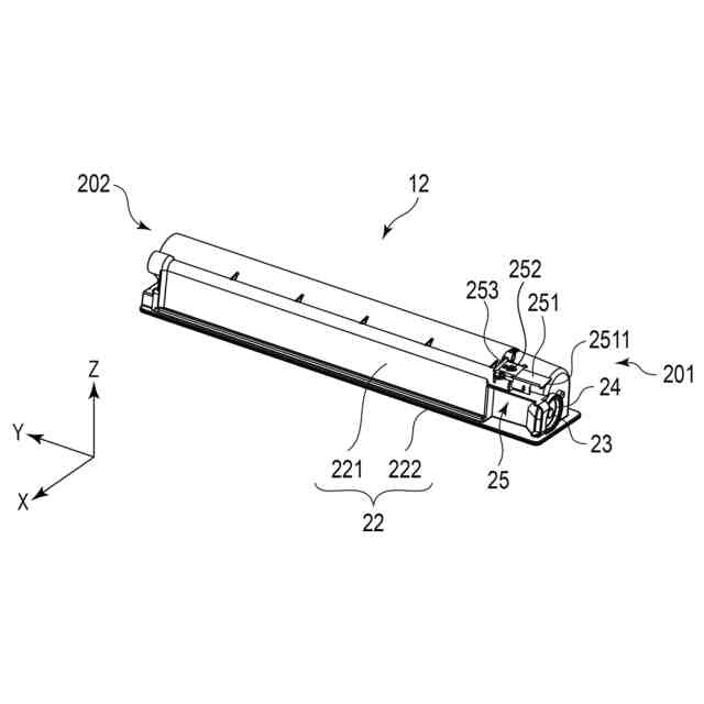 トナーカートリッジ12は、一軸に沿って長く形成される。トナーカートリッジ12は、一軸に沿って第1端201と、第1端201と反対側の第2端202とを有する。