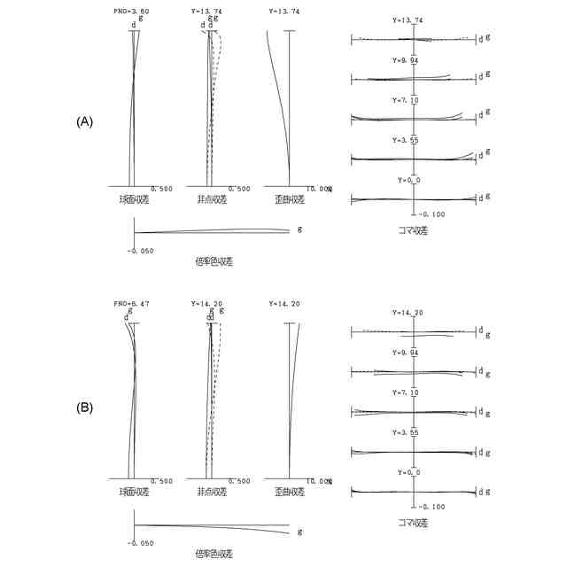 図8(A)、図8(B)はそれぞれ、第4実施例に係る変倍光学系の広角端状態、望遠端状態における無限遠合焦時の諸収差図である。