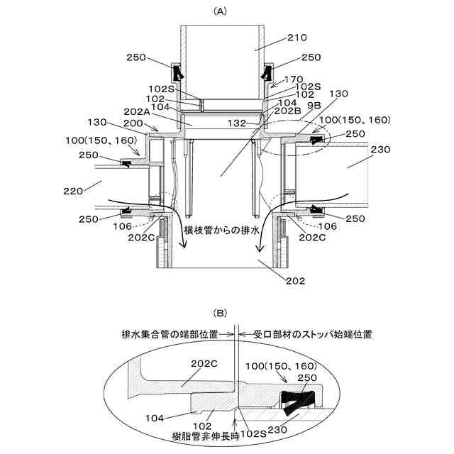 この排水集合継手において、縦管P1が熱伸長(熱収縮と同義)した場合には、エチレン-プロピレン-ジエンゴム(EPDM)等の通常排水設備に使用されているゴム材料からなる縦パッキン22が備えるリップ部22aの下端部に突出されて形成された径方向内側に突出する段部22bに、第1の縦管P1の管端部が突き当たり、第1の縦管P1の熱伸縮を吸収するようになっている(第0044段落)。