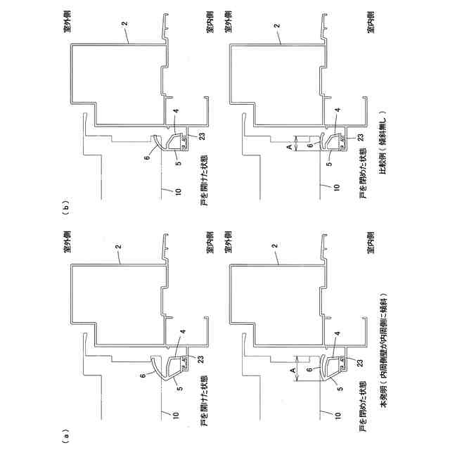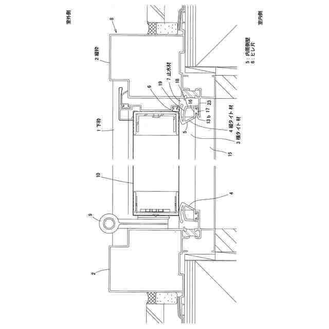 横タイト材3は、図2に示すように、タイト材ホルダー13aの室外側を覆うベース部16と、ベース部16と一体成形されタイト材ホルダー13に係合する係合部17と、ベース部16の内周側端から室外側にのびる内周側壁5と、内周側壁5の先端から外周側にのび、戸10の室内側面に当接するヒレ片6と、ベース部16の外周側端から室外側にのびる外周側壁18と、外周側壁18及び内周側壁5と接続されて中空部を構成する接続壁19とを有している。内周側壁5とヒレ片6と外周側壁18と接続壁19は、軟質の材料、例えばEPDMスポンジで形成されており、ベース部16と係合部17は、それよりも硬質の材料、例えばEPDMゴムで形成してある。内周側壁5は、室内外方向に対して内周側に11°傾斜している。