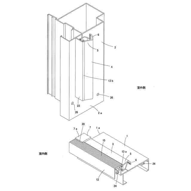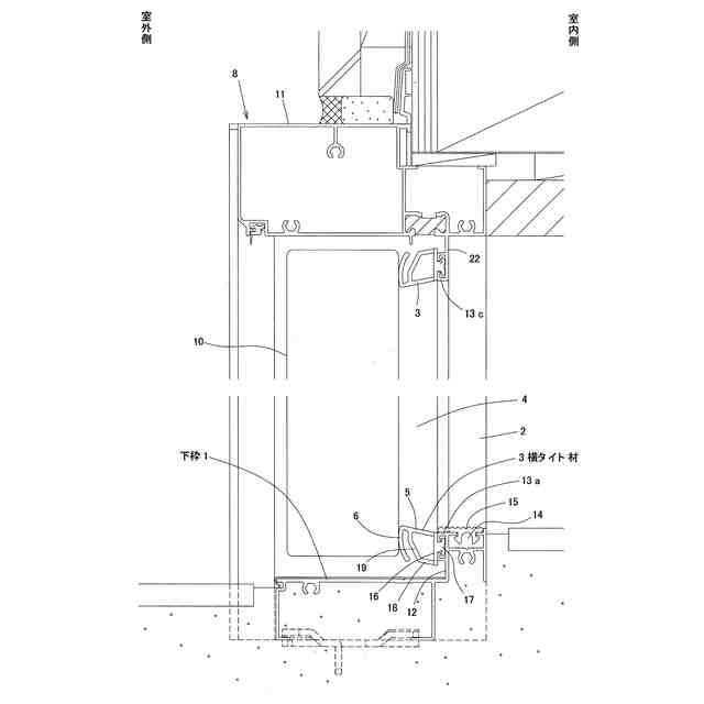下枠1は、図2に示すように、戸10の室内側に戸当たり部12が内周側に突出して設けてあり、戸当たり部12の室外側面には略C字型断面のタイト材ホルダー13aが室外側に向けて設けてあり、タイト材ホルダー13aに保持して戸10との隙間を塞ぐ横タイト材3が下枠1の長手方向に沿って設けてある。