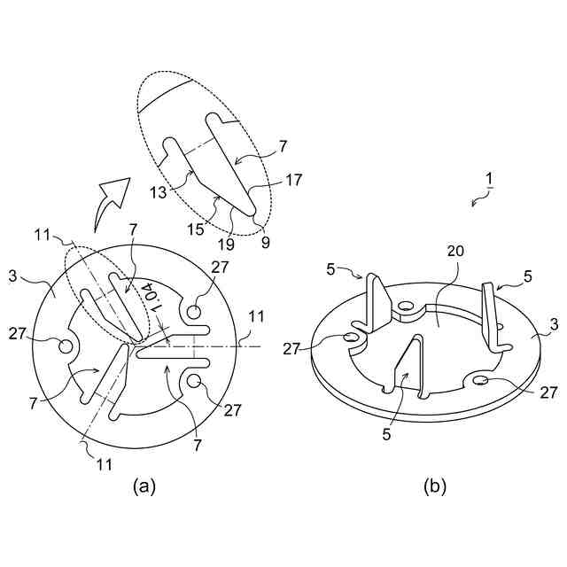 ガイドリング21の製造手順を説明する。まず、円板状の金属平板から、リング部23となる部位から中心方向に向かって延びる3つの起立前ガイド片部29とリング部23とを残して、これら以外の部位を打ち抜き又は切除により取り除く。この状態が図5(a)に示されている。