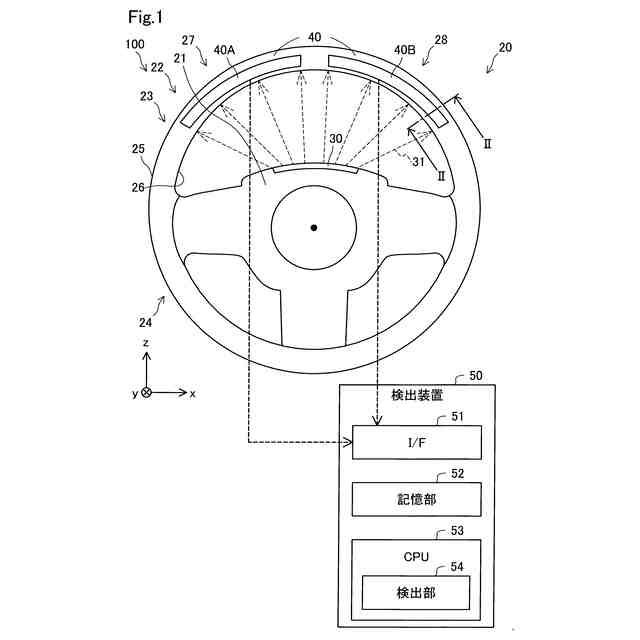 図1において、ステアリング20は、車両を直進させるときの状態で表している。図1には互いに直交するx軸、y軸、z軸を示している。x軸は、車両の左右方向である。y軸は、ステアリング20の回転軸に沿った方向である。z軸は、x軸、y軸と直交する方向である。z軸は、運転者から見て鉛直方向(鉛直上方および鉛直下方)から+y軸方向に向かって0度~10度の範囲で傾いた方向であり、単に上下方向ともいう。これらの軸は図1以降に示した軸に対応している。